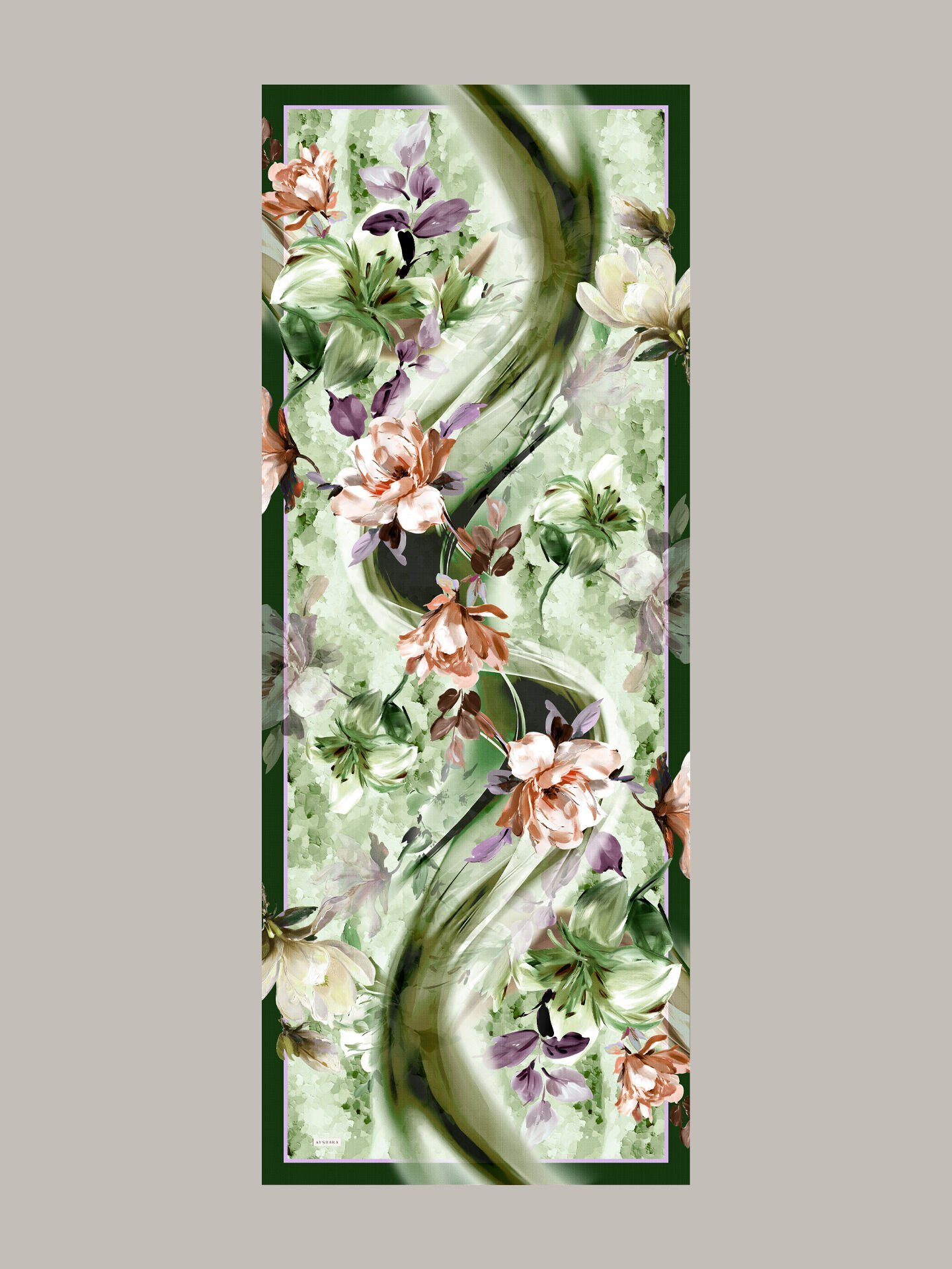 Arşiv meşklerinde tekrar edilen kavis hareketini büyütüp su lekeleriyle katmanladık; kavislerin tepe noktalarına çiçek kümeleri yerleştirdik. Böylece göz, çizgiyi izlerken çiçeklerde durup nefes alıyor; sıcak–soğuk ve açık–koyukarşıtlıkları ritmi yönetiyor. Bordür, bu akışa zarif bir “pervaz” ekliyor. Her renk, bir şehir ânına bağlandı: kıyı, iskele, akşamüstü, pazar sabahı.