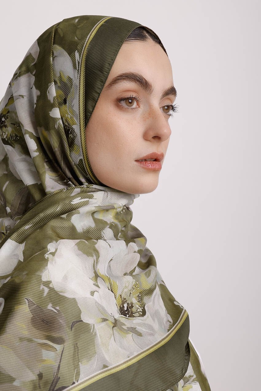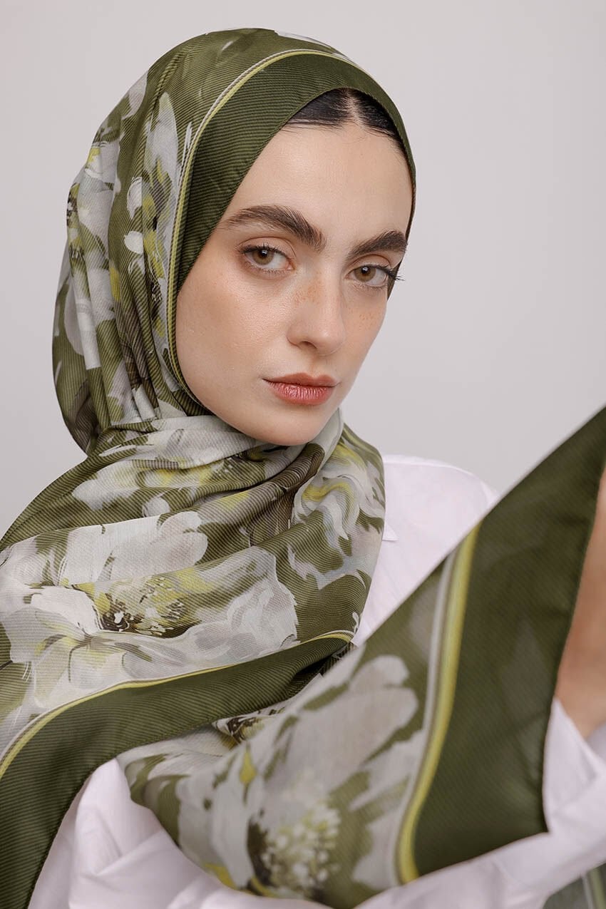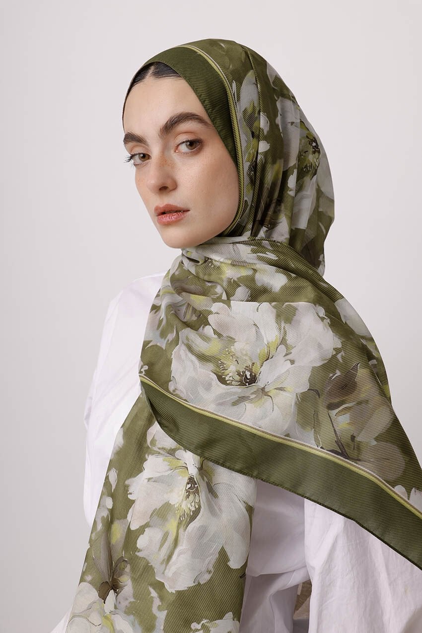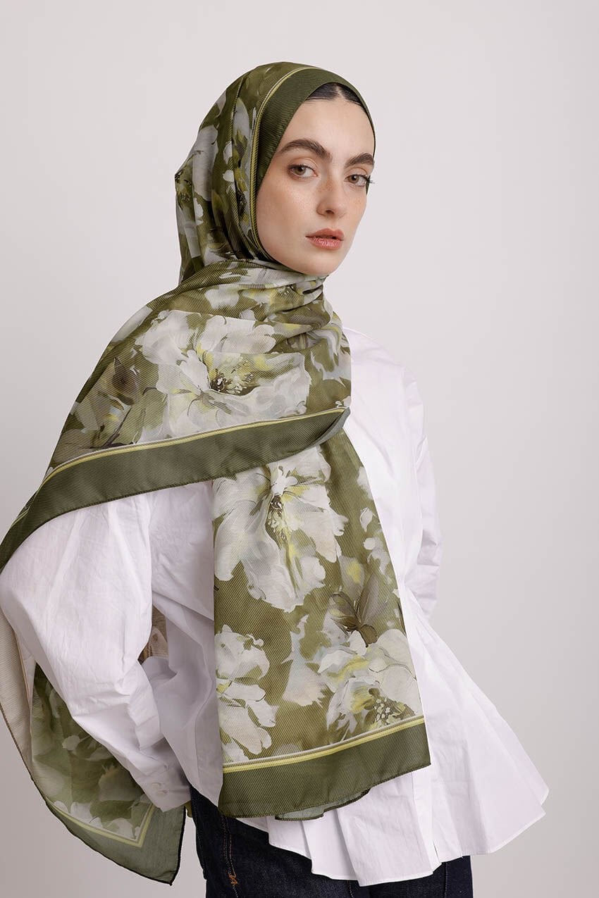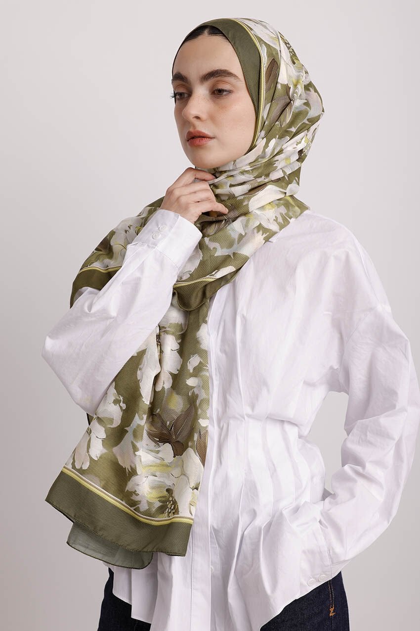 Mahperi Çiçek Desenli Tek Taraflı Şal - Haki Yeşil